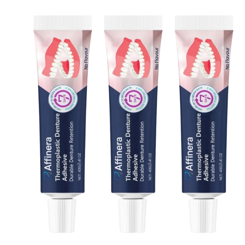 Affinera™ ist ein thermoplastischer Prothesenhalter, keine Haftcreme. Die erste Anwendung erfordert Geduld — lassen Sie es 4 Stunden aushärten, bevor Sie essen. Die Ergebnisse verbessern sich bei korrekter Anwendung. Bei Unterkiefer-Prothesen empfiehlt sich eine trockene Oberfläche für optimalen Halt. Kein Ersatz für professionelle zahnärztliche Behandlung.